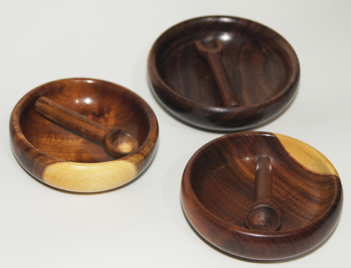 Salt/spice Bowls These small bowls (2 Gidgee and 1 Blackwood) were made on a whim, and my wife suggested there should be spoons to go with them, so who was I to doubt her? The spoons are also made from Gidgee timber. The colurs in the Gidgee are striking and the polish able to be achieved on them is very gratifying. Blackwood is just as hard on tools but more difficult to get the same level of sheen on it. Dimensions: Gidgee 82mm x 30mm. Blackwood 93mm x 33mm. Price: $45 each Both Gidgee bowls have already sold and I will be making more, and can make them in different timbers as required.