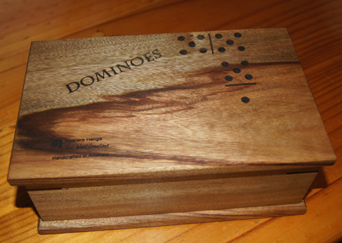 Dominoes set #1 $87.95 This 28 tile set is made from Red Cedar and have laser engraved dots. The tiles are 9cm x 4.5cm, great for the whole family to play with. The presentation/storage box is custom made to hold the 28 game pieces, and is made from Coachwood (base), Banksia (sides), and Tasmanian Oak (top). The corner splines are Rosewood. Tiles and box are finished with my home-made beeswax & mineral oil blend. Game instructions are included in the box.