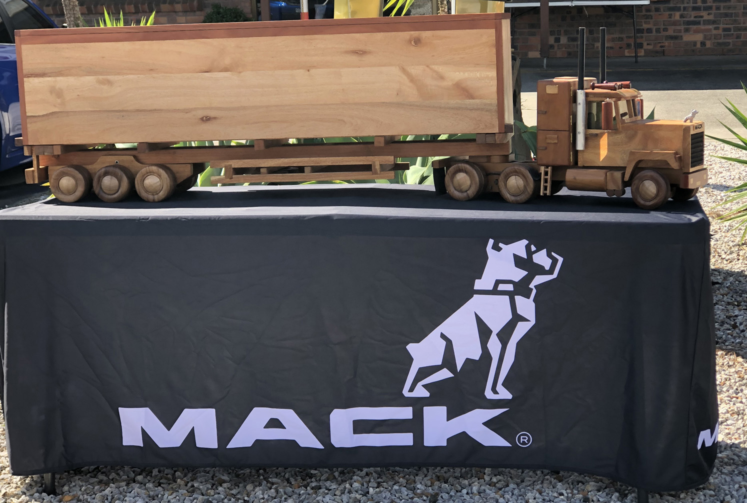 This truck is guaranteed one of a kind as design features were created by the craftsman to meet to the desired function of the project. The bulldog mascot is made from cast aluminium, using a hand carved special sacrificial foam that is replaced by the molten aluminium when poured into the sand mould. MACK lettering is laser engraved into Huon Pine. |